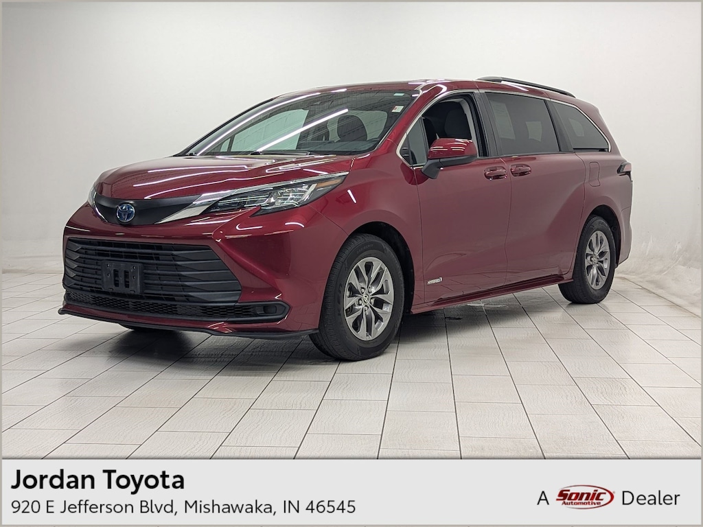 2021 Toyota Sienna LE, Front Wheel Drive, LED Headlights, Bluetooth Connection, Steering Wheel Audio Controls, Woodgrain Interior Trim, Immobilizer, Blind Spot Monitor, Cross-Traffic Alert, Lane Departure Warning, Lane Keeping Assist, Back-Up Camera, Red exterior, and Tan interior.